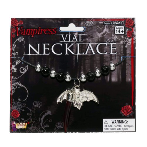 Bring a snack on the go with our Vampire Blood Vial Necklace. There is no reason for a blood thirsty creature to go without their evening snack! Our Vampire Blood Vial Necklace features a red-colored fang shaped vial with a dangling bat charm pendant that hang from a black cord necklace accented with wood and metal beads. Unscrew the vial to fill it with fake blood gel or wear it as it is. This costume jewelry piece makes a great necklace accessory to your vampiress costume. Recommended Age: 14+ YearsAvailable at Amazon >>Check Price Now!<<